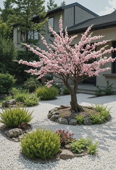 Low shrubs, white gravel, and a single blooming cherry tree define this peaceful setup. Small flowering ground cover adds gentle color beneath the structure. It’s simplicity with intention and grace.