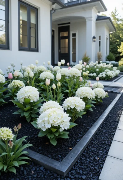 Crisp white blooms like alyssum, hydrangea, and tulips sit on dark mulch, creating a bold contrast. A clean border of sleek metal edging holds it all together. The whole setup feels calm, modern, and fresh.