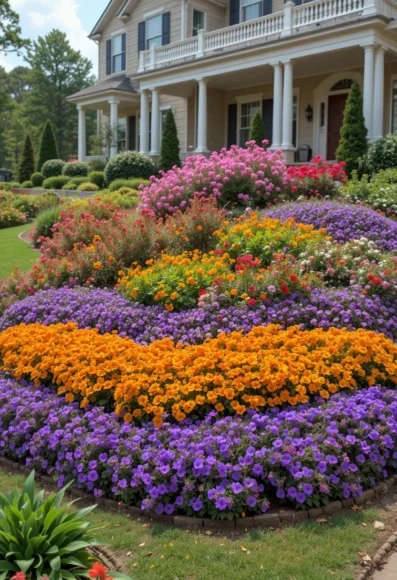 Each layer in this sloped bed has its own color theme—pinks on top, oranges in the middle, purples below. Flowering plants like salvia, marigold, and petunia fill the steps. It’s a visual cascade that leads the eyes downward.