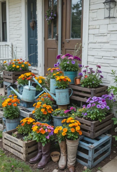 Old watering cans, boots, and vintage crates are used as planters within this bed. Marigolds and pansies spill out of each one in a mix of shapes and textures. It adds character and sparks conversation.