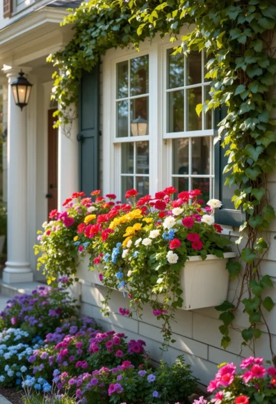 Mounted just below the front windows, these raised boxes are packed with geraniums, petunias, and trailing vines. The color draws your eye up toward the windows. It adds instant charm and curb appeal.