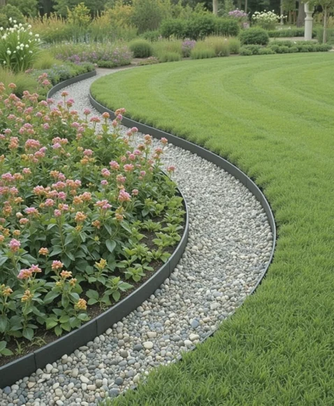 Metal edging gives your garden a crisp, modern outline without overpowering the overall design. I like how durable it is and how it stays straight without shifting over time. You can choose steel, aluminum, or weathered corten steel for that trending rusted look. It works beautifully around lawns, pathways, or minimalist plant beds. This option is also ideal if you want clear separation between gravel and grass.