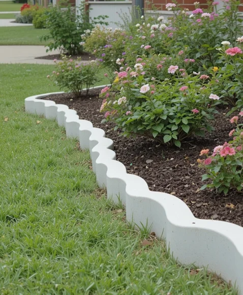 Scalloped concrete edging adds gentle curves and a playful yet structured look. I find it perfect for family-friendly yards or gardens that need a decorative border without being too fancy. The scallops add a visual rhythm that looks great with flowers or shrubs. It’s easy to install and stays stable for years. This edging creates a welcoming feel that fits many American home styles.