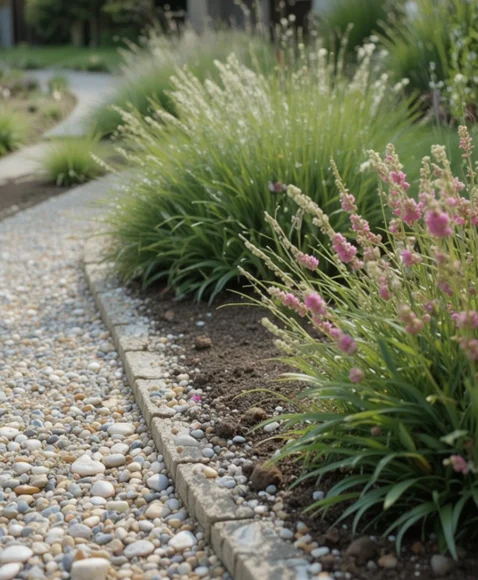 A pebble-filled trench gives your garden a light, airy look while controlling weeds and runoff. I love how easy it is to customize with different pebble colors or sizes. This edging is great for separating grass from pathways or plant beds. Pebbles offer beautiful contrast against greenery, creating a calming, spa-like feel. It’s a low-maintenance choice that stays looking fresh for years.