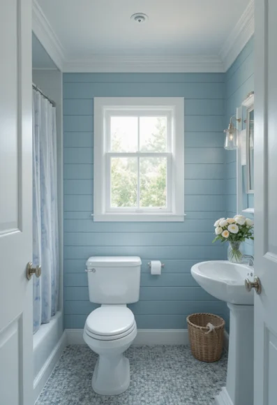 Add texture with horizontal shiplap boards painted in a muted blue. It gives the bathroom a coastal touch without going full nautical. It also softens the space.