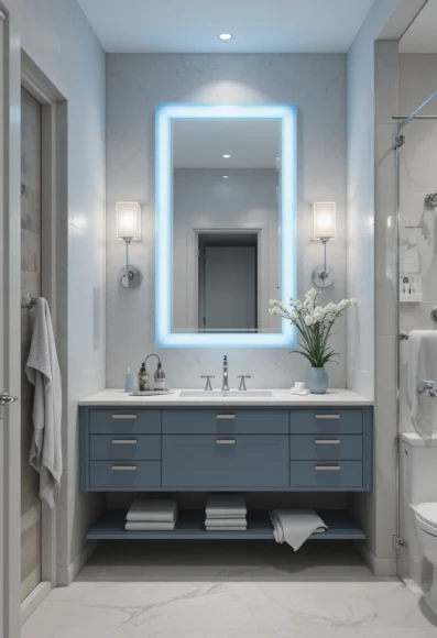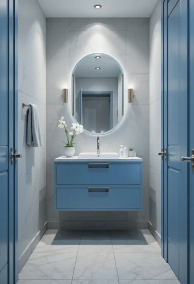 A sleek, floating vanity in soft powder blue adds both style and storage. The color lifts the room visually while keeping things minimal. It works well in small bathrooms with clean lines.