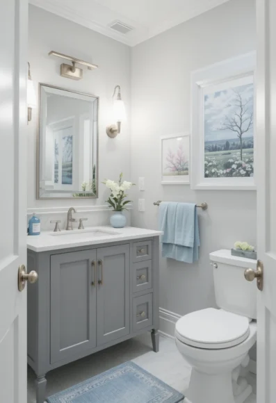 Pair brushed nickel fixtures with subtle light blue accents like soap dishes, towels, and planters. The combination feels clean and polished. It’s an easy update without remodeling.