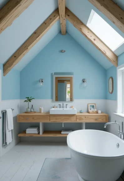 Paint exposed beams in a gentle blue shade for charm and visual interest. It adds color high up without closing in the room. Great for bathrooms with vaulted ceilings.