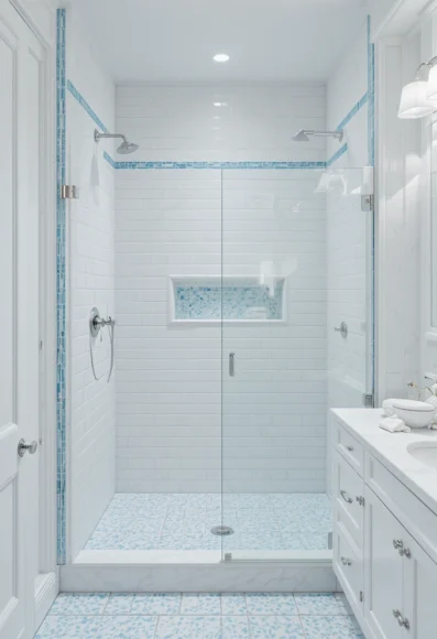 Frame the shower or tub area with a slim line of light blue tile inlay. It defines the space and brings a soft touch of color. Works well in all-white or neutral spaces.