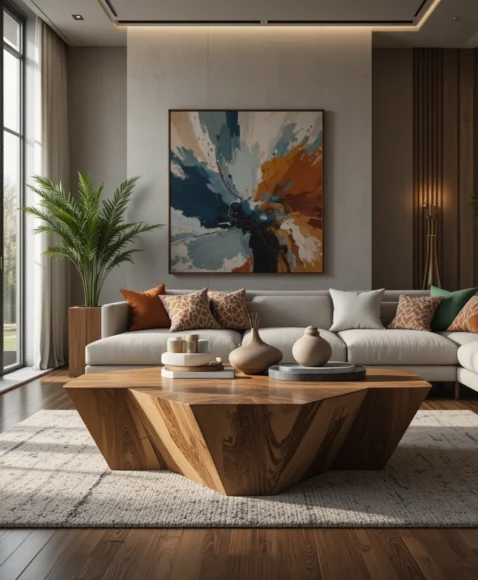 A geometric coffee table features bold shapes and artistic lines that reflect the creative spirit of mid century design. The tabletop may include angular cuts or layered surfaces that create visual interest.