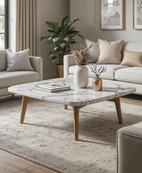 The natural veining in the marble adds elegance while the wooden base keeps the design warm and inviting. This table works beautifully in upscale living rooms with neutral color palettes.