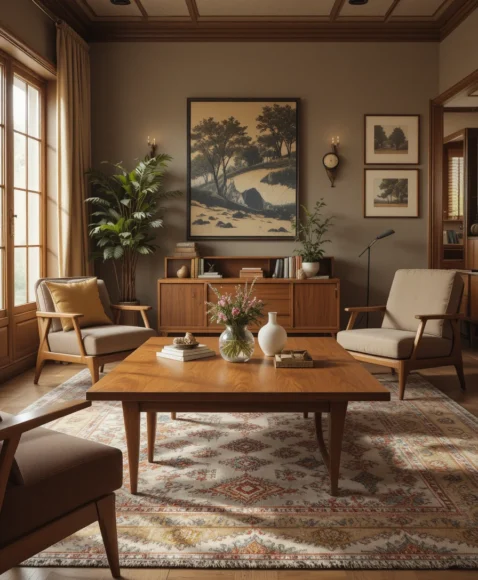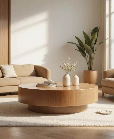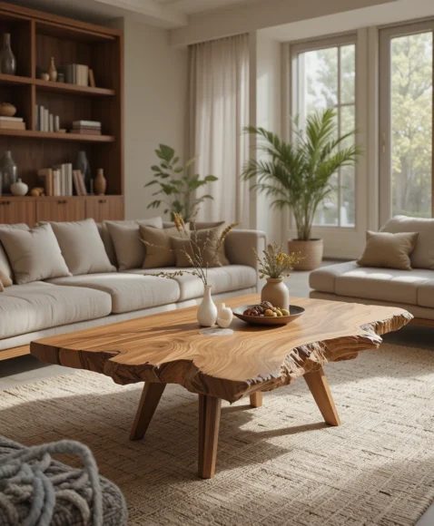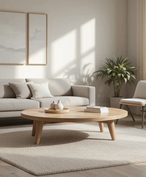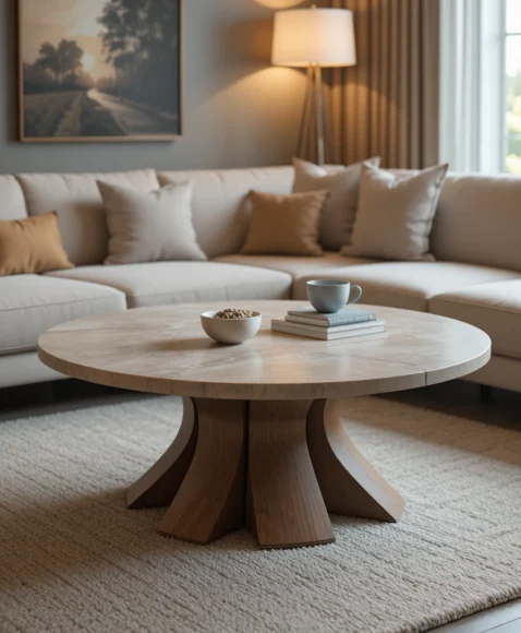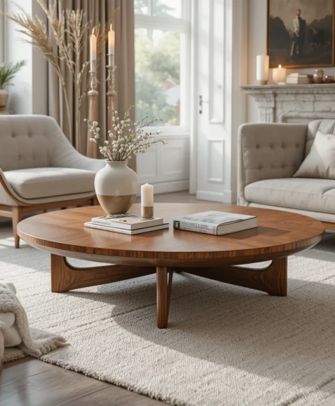 Often designed with a sculptural wooden base and a smooth round top, this table becomes both furniture and artwork. Its elegant curves and natural wood tones give the living room a relaxed retro charm.