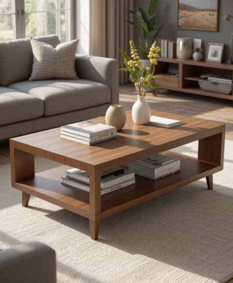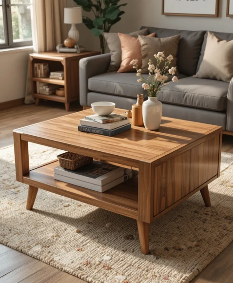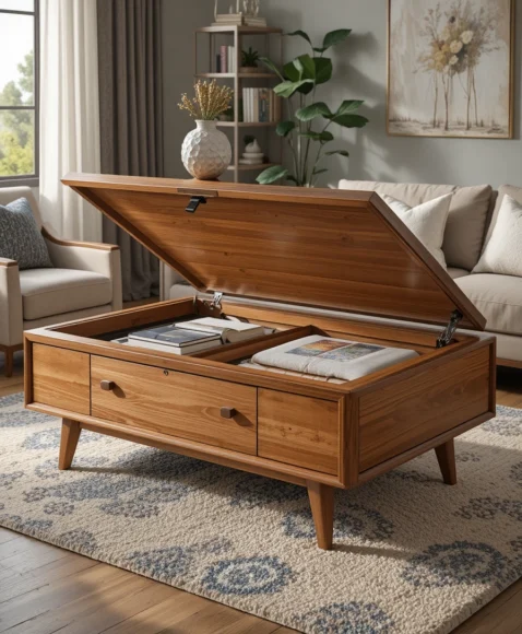 A storage coffee table offers hidden compartments that keep the living room tidy. The design often includes sliding panels or lift-top sections that reveal storage spaces underneath.