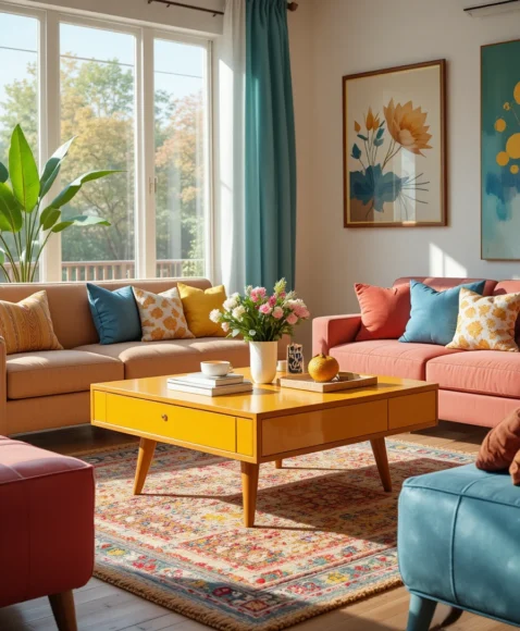 A retro accent coffee table introduces playful mid century colors such as mustard yellow, teal, or burnt orange. The colorful surface contrasts with natural wooden legs.