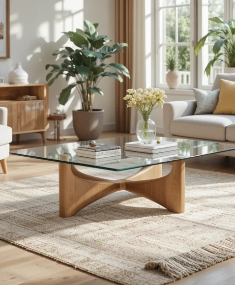A glass and wood coffee table combines transparency with natural warmth. A clear glass top sits above a beautifully crafted wooden base, allowing the structure to remain visible.
