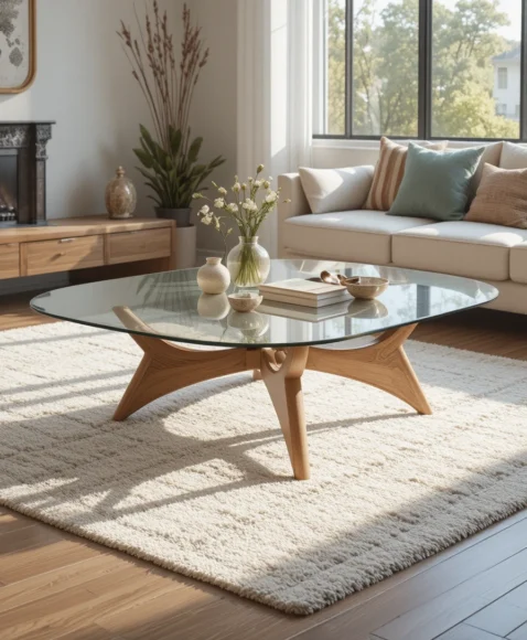 A glass top mid century coffee table blends modern transparency with vintage structure. The base is typically made of sculptural wood with curved supports that hold a clear glass surface.