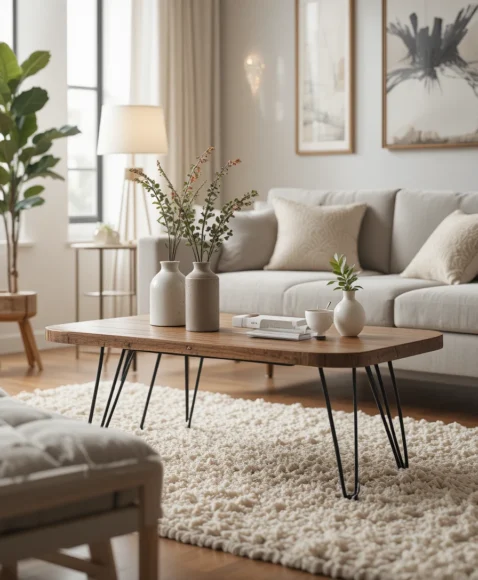 A hairpin leg coffee table combines mid century simplicity with a slightly industrial edge. The thin metal hairpin legs support a wooden tabletop, creating a minimalist and stylish look.