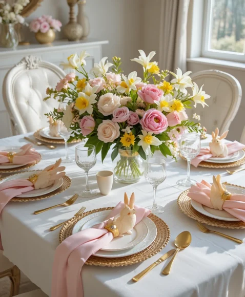 Design a dining table with a crisp white tablecloth and pastel plates. Place a floral arrangement of pink peonies, yellow daffodils, and white lilies in the center. Add bunny-shaped napkin rings and gold cutlery for a polished finish. The result is a bright and inviting Easter table decor setup perfect for brunch.