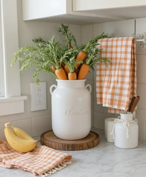 Add playful carrot-themed decor to your kitchen counter. Use a white ceramic jar filled with faux carrots and a wooden cutting board as a base. Pair it with gingham kitchen towels in orange and white for a subtle farmhouse touch.