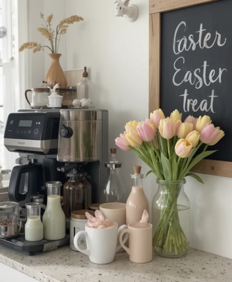 Decorate your coffee station with bunny mugs, pastel syrup bottles, and a small chalkboard sign reading “Easter Treats.” Add a vase of fresh tulips beside your coffee machine to create a warm and inviting spring coffee nook.