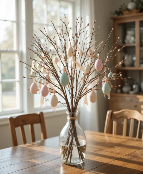 Place decorative branches inside a tall clear glass vase. Hang pastel-painted eggs with thin satin ribbons from each branch. Set this on a wooden dining table with natural light streaming through the windows for a soft spring glow.
