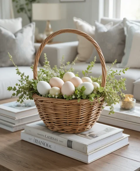 Place a woven Easter basket filled with pastel eggs and fresh greenery at the center of your coffee table. Surround it with stacked books in neutral tones for a styled, layered look.