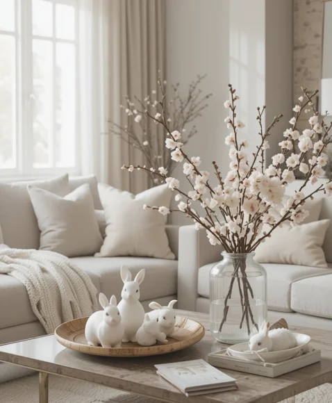 Decorate with white ceramic bunnies, soft beige throw pillows, and a light knit blanket. Add a glass vase with cherry blossom branches on your coffee table. This neutral Easter decor style feels calm, modern, and perfect for minimalist homes.