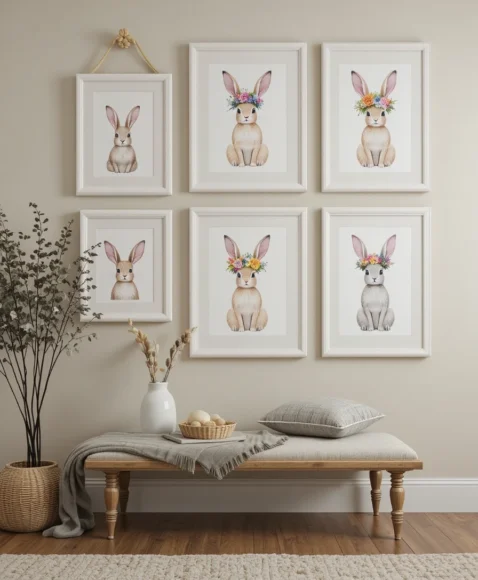 Create a gallery wall featuring framed bunny illustrations with floral crowns. Use white frames and soft watercolor prints to maintain a cohesive look. Arrange the frames symmetrically for a polished finish.