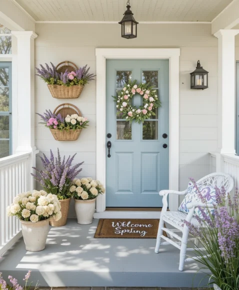 Hang multiple wicker baskets filled with faux lavender and tulips on your porch wall. Layer a pastel wreath on your door and add a “Welcome Spring” doormat. Keep the porch furniture in white or light gray for a clean, bright outdoor look.