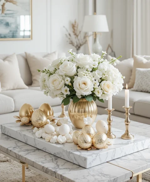 Use gold egg accents and white marble trays on your coffee table. Add metallic candle holders and a large white floral arrangement. This modern Easter decor style feels elegant and perfect for upscale homes.