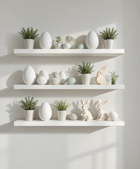 Decorate floating white shelves with simple ceramic eggs, small potted greenery, and light wooden bunny cutouts. Keep the color palette neutral—white, beige, and soft sage—for a clean Scandinavian style.