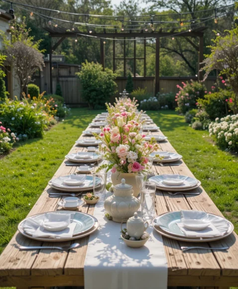 Set up a long wooden table outdoors under string lights. Use floral centerpieces, pastel plates, and soft linen napkins. Surround the table with green grass and blooming flowers to capture a natural spring garden atmosphere.