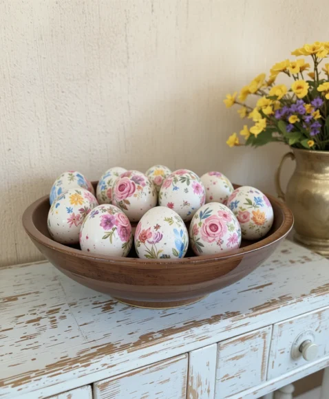 Arrange hand-painted wooden eggs inside a shallow wooden bowl. Use soft speckled designs and watercolor florals for detail. Place the bowl on a distressed wood console with a soft beige background for that perfect rustic spring image.