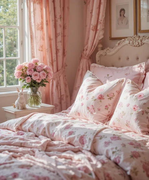 Decorate your bedroom with blush pink pillows, floral bedding, and a small bunny figurine on your nightstand. Add a clear vase with fresh roses near a sunlit window for a gentle and romantic Easter-inspired bedroom look.