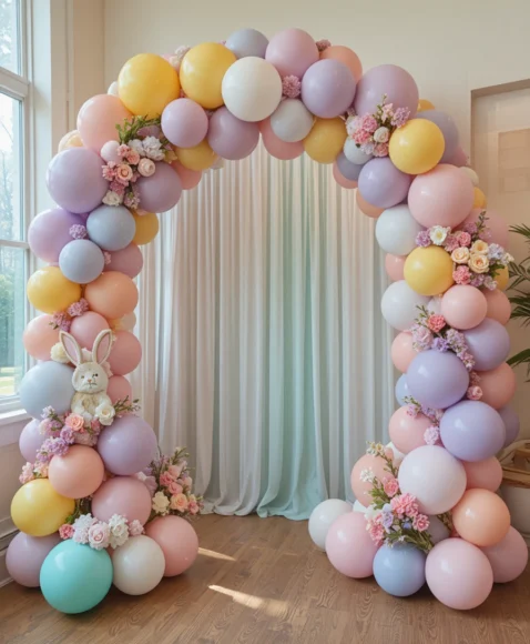 For a festive look, create a pastel balloon arch in shades of pink, yellow, lavender, and mint. Add small bunny cutouts and floral accents to the arch for a perfect Easter celebration backdrop.