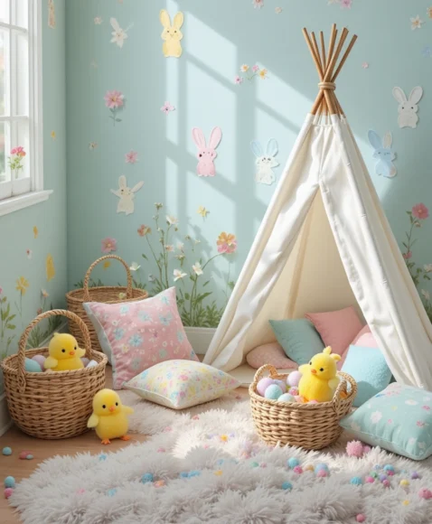 Create a colorful Easter-themed corner with pastel floor cushions, bunny wall decals, and a small white teepee tent. Place woven baskets filled with plush chicks and eggs around the space for a playful and cheerful environment.