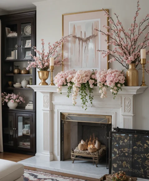 Pair blush-toned florals with gold candle holders for a subtle glam spring look. The soft pink flowers soften the metallic shine, creating a balanced and elegant mantle display.