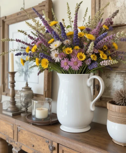 Use a large white farmhouse pitcher as a statement piece. Fill it with wildflowers in soft purple, yellow, and white shades. Let the flowers fan out naturally for a relaxed spring feel.