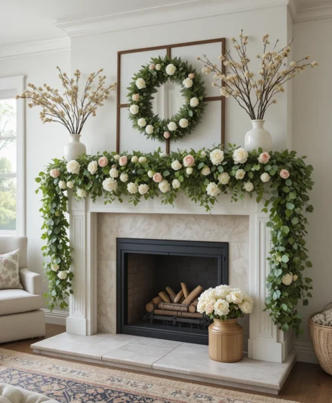 Drape a lush eucalyptus and faux peony garland across the mantle for a soft, natural look. Let the greenery slightly cascade over the edges for movement. Pair it with white ceramic vases and light wood accents to create a balanced spring vibe. This works beautifully in farmhouse and modern spaces alike.