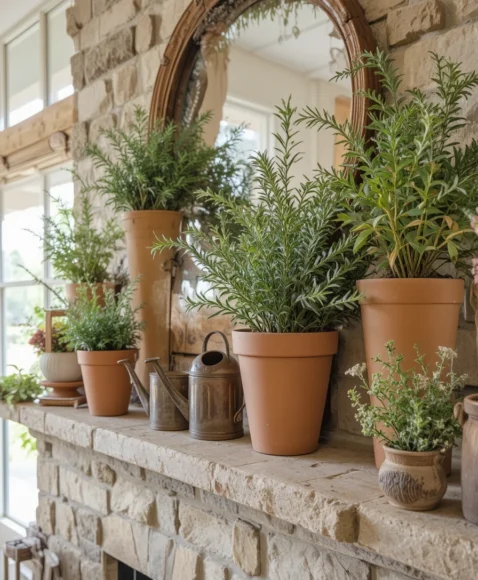 Use small terracotta pots filled with faux herbs like rosemary and thyme. Arrange them in uneven heights for visual interest. Add a small watering can decor piece for a true garden-inspired feel.