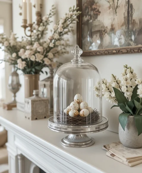 Place a glass cloche over a small nest, faux eggs, or mini floral arrangement. This adds a charming seasonal detail without overwhelming the mantle.