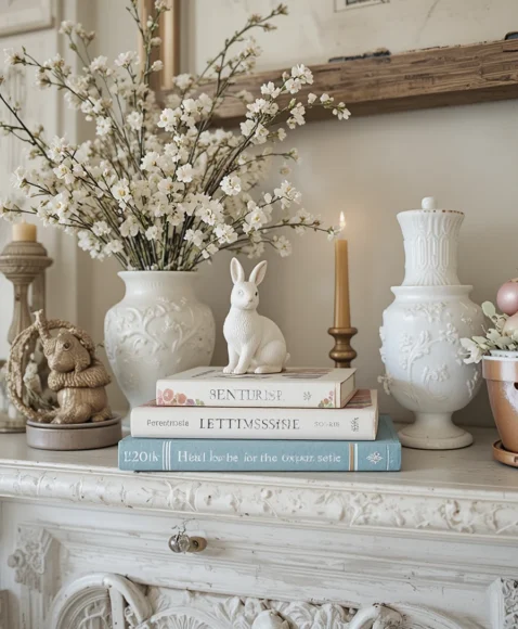Stack neutral-colored books horizontally and top them with a small bunny figurine or floral arrangement. The layered books add height while keeping the decor grounded.