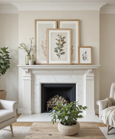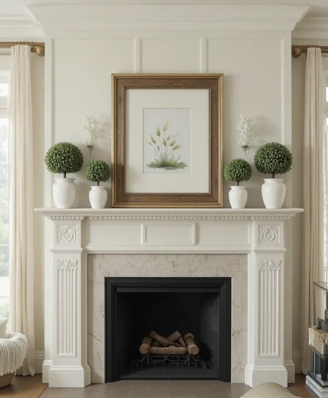 Place matching small topiary trees in white pots on both ends of the mantle. Add a simple framed art piece in the center. The symmetry gives a clean and polished appearance.
