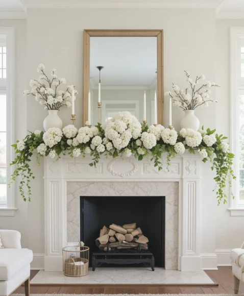 Keep everything white—white vases, white candles, and white flowers like hydrangeas. Add just a touch of greenery for contrast. The result feels fresh, clean, and timeless for spring.