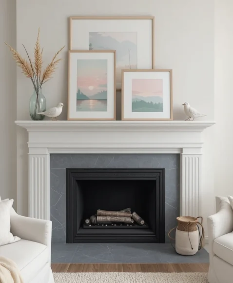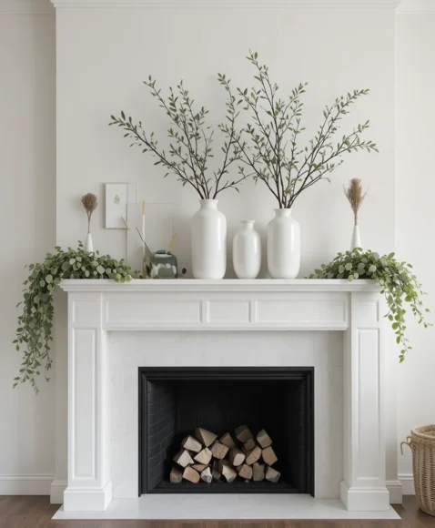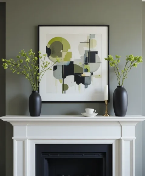 If your fireplace is modern, use matte black vases filled with bright green stems. Add a simple abstract art piece above. The bold contrast feels fresh yet contemporary.