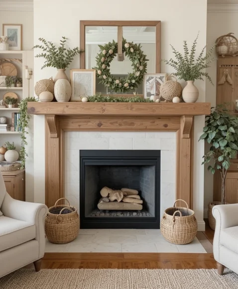 Add woven baskets, rattan decor balls, and light wood picture frames. Combine these with subtle greenery to create a warm, earthy spring fireplace mantle decor theme.
