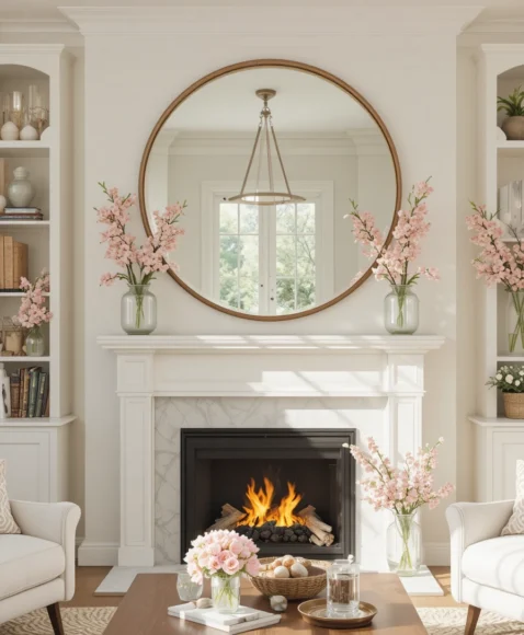 Hang a large round mirror above the mantle to reflect natural light. Place two tall glass vases filled with tulips or cherry blossoms on either side. The reflection doubles the brightness and makes the room feel larger, perfect for cozy American living rooms.