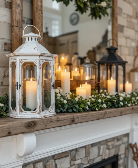 Place black or distressed white lanterns on each side of the mantle. Inside, add flameless candles surrounded by faux greenery rings. The warm glow combined with fresh greenery creates a welcoming farmhouse-inspired spring setup.