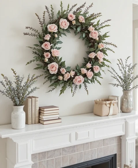 Hang a light floral wreath above your fireplace. Choose one with soft pink roses, eucalyptus, and subtle lavender sprigs. Below it, add a few stacked books and a small woven basket for texture.