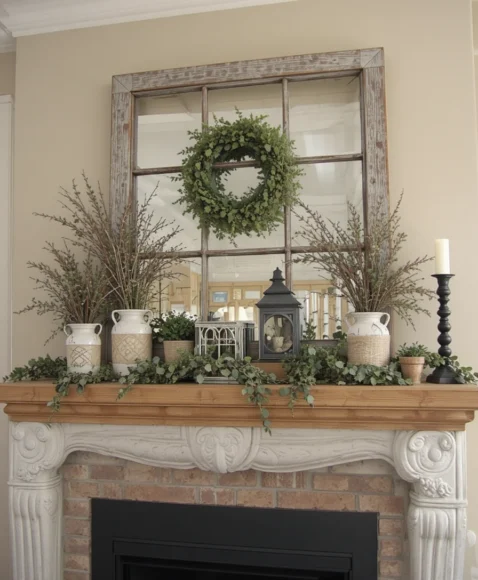 Lean a distressed wooden window frame against the wall behind the mantle. Decorate around it with potted plants and antique candle holders. This adds a charming rustic touch that feels cozy and lived-in.